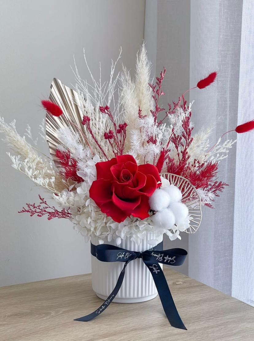 - Featuring preserved hydrangea and rose, paired with delicate dried florals and natural textures, this piece brings quiet elegance to any space.Designed in a modern ceramic vase with a soft ribbon accent.