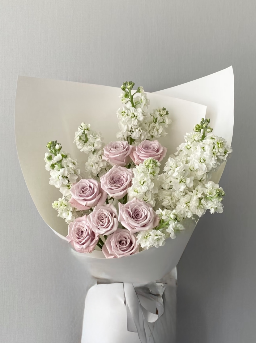 - A refined minimalist bouquet featuring only two timeless blooms — classic roses and elegant stocks. Designed with intention, this arrangement celebrates balance, softness, and quiet luxury. Perfect for anniversaries, intimate celebrations, or simply to express understated affection, each bouquet is handcrafted with premium fresh flowers and wrapped in a clean, modern style. Less is more. This bouquet speaks through purity, contrast, and lasting beauty.